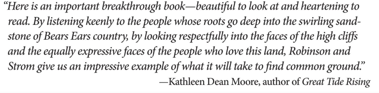 My first book, Voices from Bears Ears: Seeking Common Ground on Sacred Land, was published in October 2018 by the University of Arizona Press. Featuring photographs by Stephen Strom and a Foreword by renowned historian Patricia Nelson Limerick, Voices is in its second printing and was a finalist for the 2020 Oregon Book Award in the General Nonfiction category.
